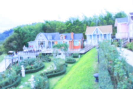 Countryside rental cottages with pop art stylization in red tones in sunny day