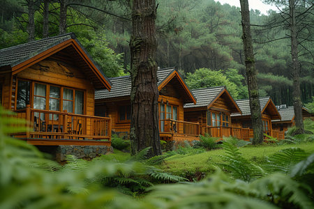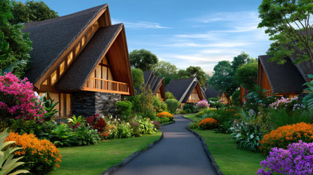 Pathway winds through vibrant garden filled with fresh vegetables. Modern wooden cabins stand amidst greenery, creating peaceful retreat. Concept of nature, eco-tourism, gardening.