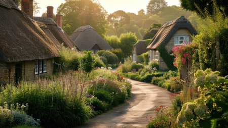 A picturesque lane meanders through an idyllic English village, lined with charming thatched cottages and vibrant, blooming gardens at sunset. Resplendent.