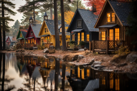 An inviting view features two houses framed by a wooden foreground. The image displays a daylight scene with warm tones and textured wooden elements. The composition suggests an inviting atmosphere. Suitable for a range of creative projects, this image could be used for websites, brochures, or editorial content.