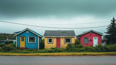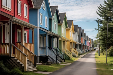 A row of vibrant houses in the neighborhood showcasing a variety of colors and architectural styles, creating a striking visual display.