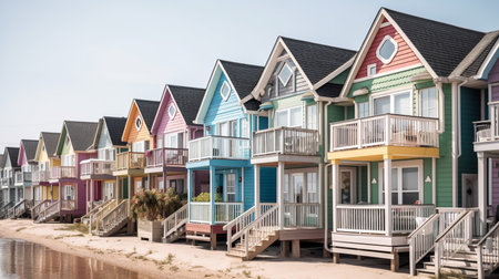 A harmonious lineup of multicolored beach townhomes on a sunny day, with people and pets enjoying the seaside