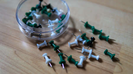 Top view of full thumb tacks in a transparent box and scattered on wooden background. It is a short nail or pin used to fasten items to a wall or board for display. Selective focus on foreground.