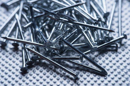 Blue pushpins on the blue backgound. Top view of lots of push pins
