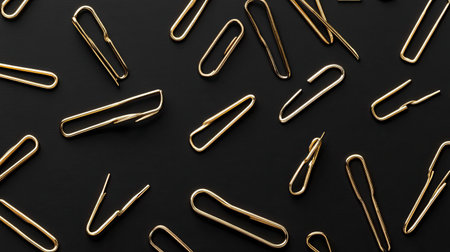A captivating flat lay of gold paper clips scattered across a sleek black surface, emphasizing modern workspace aesthetics and organizational simplicity.