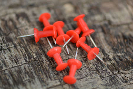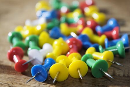 Thumbtacks of different bright colors are scattered randomly on a wooden background