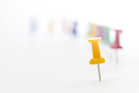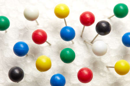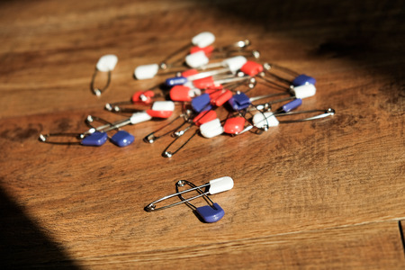 Close up of different coloured pins on a light background. Shallow depth of field. Retro filter applied.