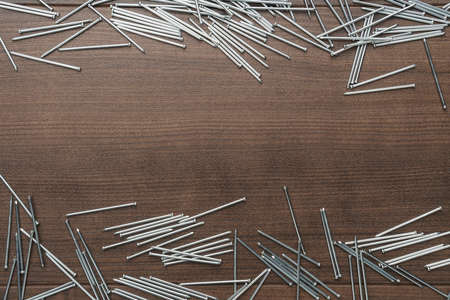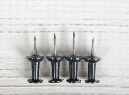 Close-up black macro thumbtacks are in a row on wooden surface. Top view.