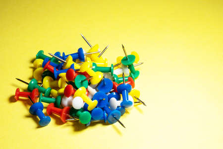 Top view of a bunch of colored stationery buttons on a yellow background. Large. Free space for copying, design or text