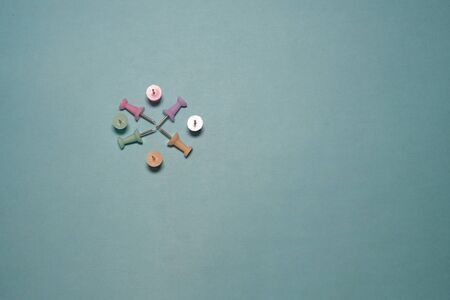 Horizontal close-up flat lay composition of multi-colored stationery buttons on a light blue background. Items of green, red, yellow and blue colour in the lower left corner . Office supplies concept. Stationery. Horizontal photo. Back to school, college, education concept. Space for text, copy space.