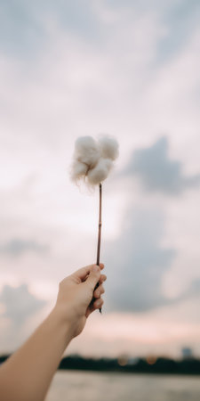 Hand holding a delicate cotton bloom on a thin branch, extending upward against a soft, cloudy sky and a faint distant horizon suggesting nature and simple elegance