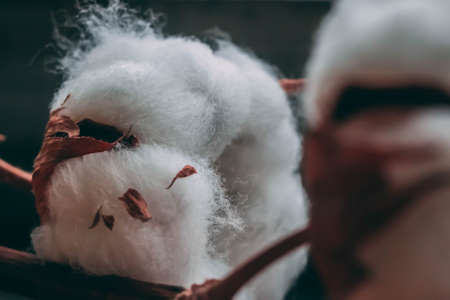 Cotton plant. Branch of dry white cotton flowers on blurred white soft cotton balls background, selective focus. Natural eco-friendly material