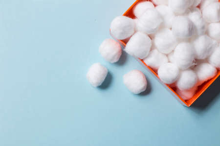 Bath accessories. Products for remove cosmetics. Cotton swabs and cotton pads on blue background top view