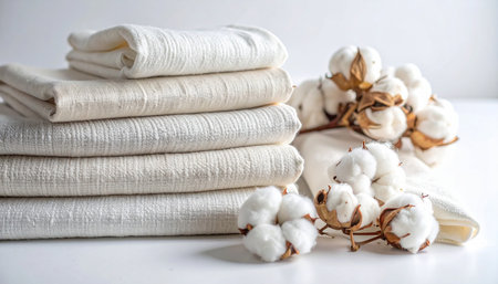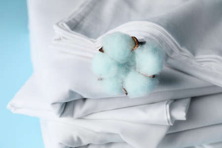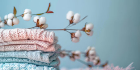 Stack of folded pastel clothes with cotton branch, representing softness and natural fabric quality. High quality photo