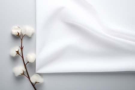 White fabric and cotton branch on white background. Flat lay, top view