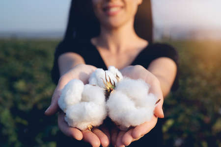 natural product, raw cotton flowers on woman's hands on green cotton field outdoor background