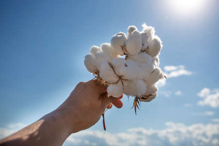 Cotton plant in hand on a background of blue sky with clouds