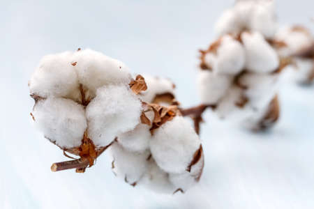 Cotton branches with fluffy white bolls on a textured blue background, side view. Minimalist nature and organic farming concept
