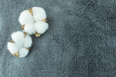 Flowers composition. Cotton flowers on bath towel background. Flat lay, top view, copy space