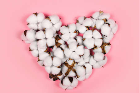 Heart shape made of cotton flowers on pink background