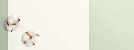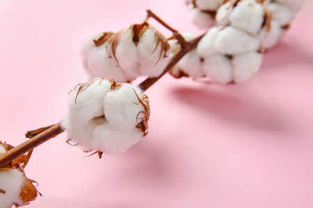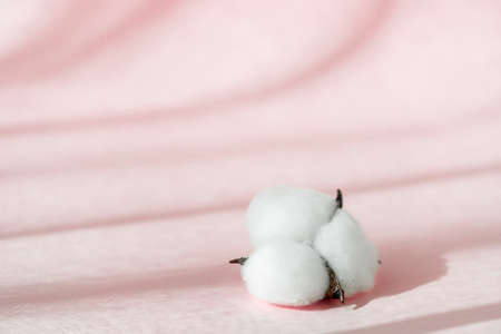 Banner with cotton branch on a pink pastel background. Minimal concept with copy space.