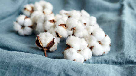 Cotton Flowers and White Cloth on Blue Background
