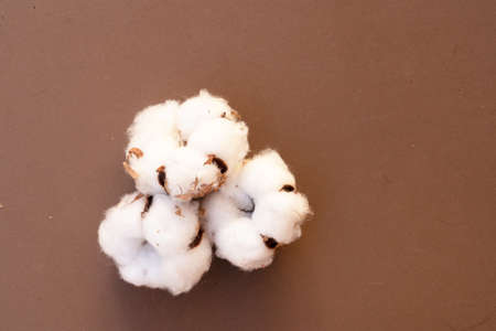 Cotton plant on brown background. top view, copy space