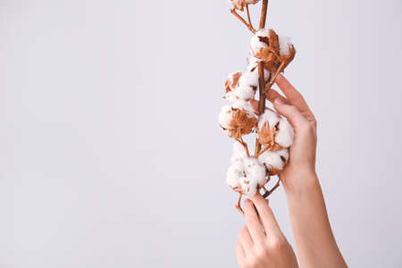 Female hands with beautiful cotton flowers on light background