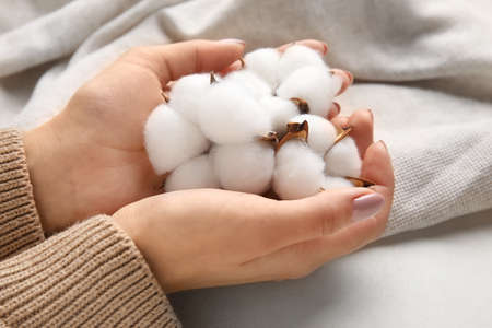 Photo of sprig of cotton with balls in female hands, dress made of natural materials.