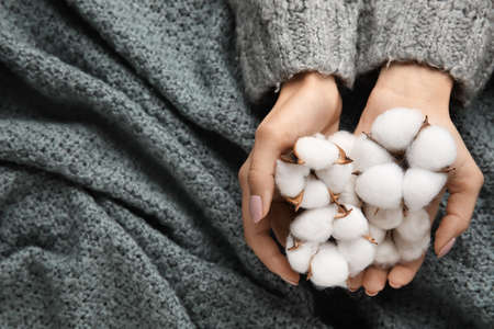 Female hands with beautiful cotton flowers on knitted fabric background