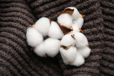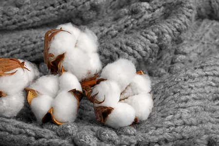 Beautiful cotton flowers on gray knitted fabric background