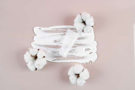 Cosmetic tube with copy space and cotton flowers on pastel violet background. Concept of hypoallergenic cosmetic product for skin or hair care. High quality photo