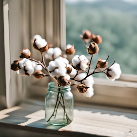 Bunch of cotton branches in a glass jar by sunny farmhouse window