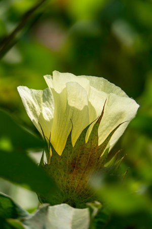 Delicate pale yellow cotton flowers close-up among green foliage. Selective focus. Israel