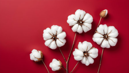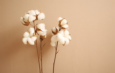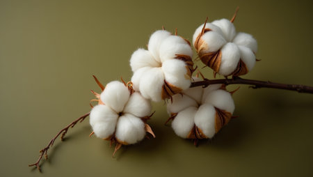 Minimal cotton plant composition on a clean pastel background highlights natural fibers, agricultural purity, sustainable materials, and calm botanical design