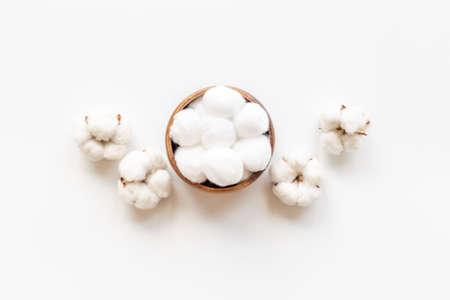 Beautiful cotton flowers on a white background. The softness of the buds gives comfort to the image. A place for your ad.