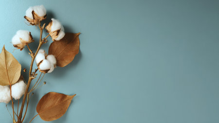 Cotton branches with fluffy white bolls on a textured blue background, side view. Minimalist nature and organic farming concept