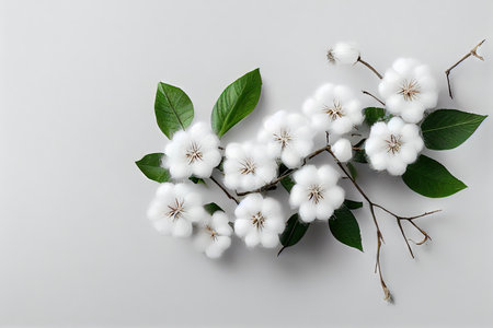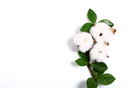 Cotone flowers on a branch with green leaves, white background. Copy space, place for your text. Top view.