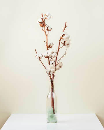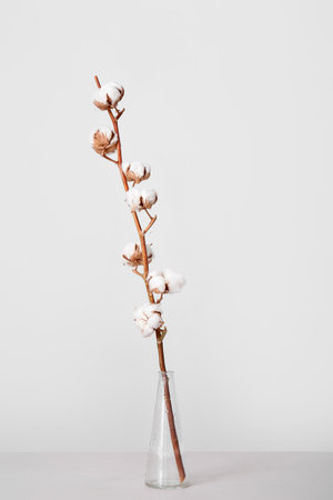 A branch of cotton in a vase on a white cloth. Concept white on white. home interior. copy space