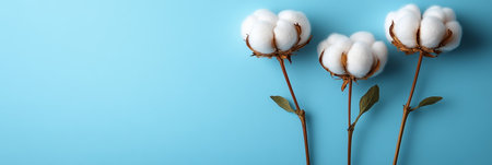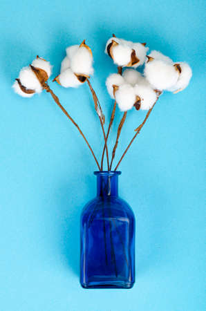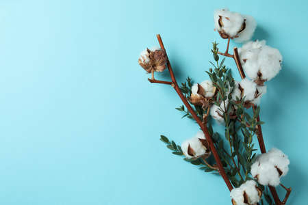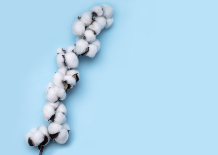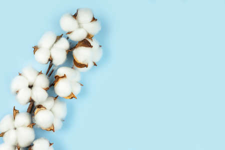 Branch with white cotton flowers on blue background. Natural organic fiber, agriculture, cotton flower, raw materials for making fabric. Backdrop, mockup with copy space for text