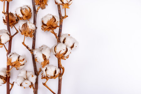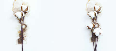 Home decoration, dried branch with bolls of cotton plant, source of natural fiber kitchen and bed textile on white background copy space