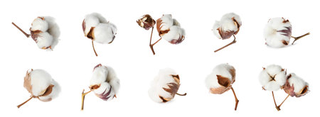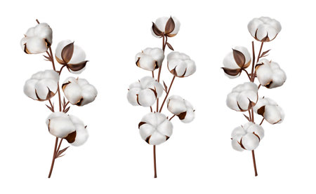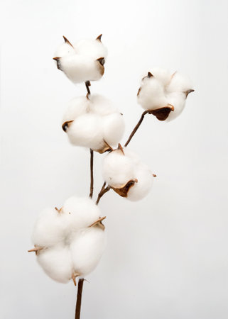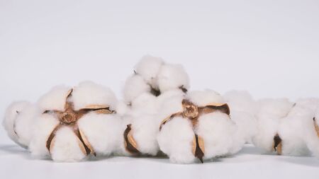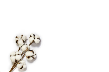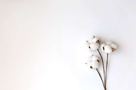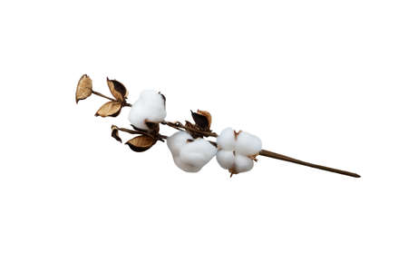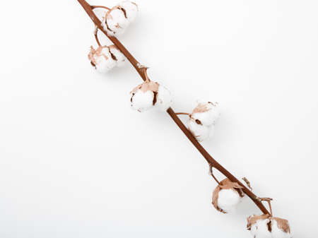 Cotton branch on a white background. Delicate white cotton flowers. Natural organic fiber, agriculture, cotton seed, fabric raw material