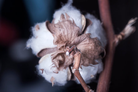Cotton flower on a branch on a dark background close-up