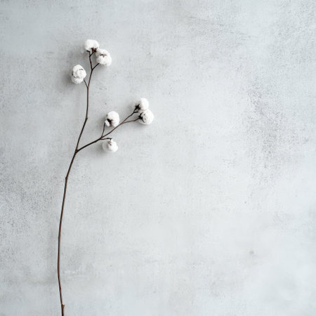 A delicate cotton branch with fluffy white flowers rests against a textured gray surface creating a minimalist and serene aesthetic.
