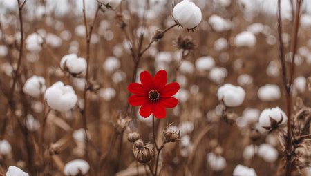 A vibrant red flower takes center stage against a soft, blurred background of brown stems and fluffy white cotton bolls, creating a contrast in texture and color.