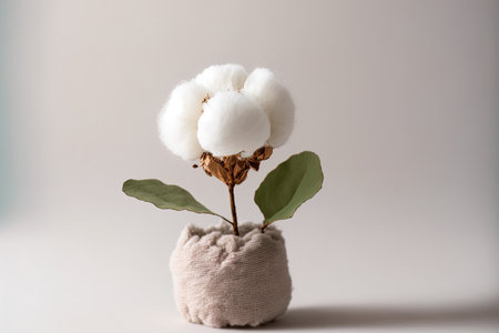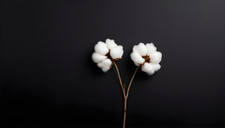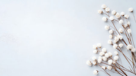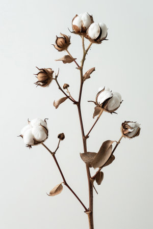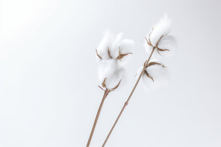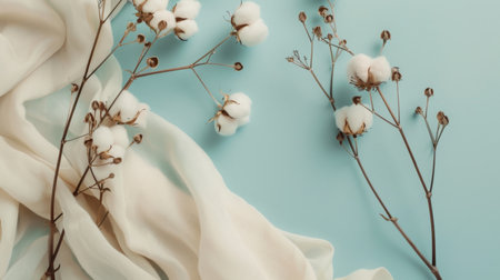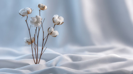 This charming image features delicate cotton flower stems gracefully arranged on soft white fabric, highlighting the beauty of nature and simplicity. Perfect for home decor and design projects.