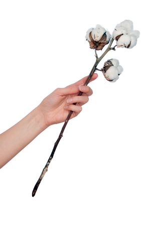 Woman hand holding dried white cotton flower isolated on white background. Fabric cloth softness natural organic farm allergy concept