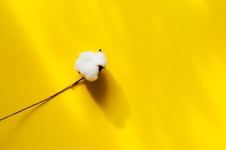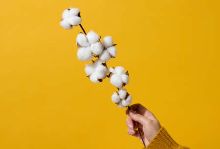 female hand holding a twig with cotton flowers on a yellow background, close up