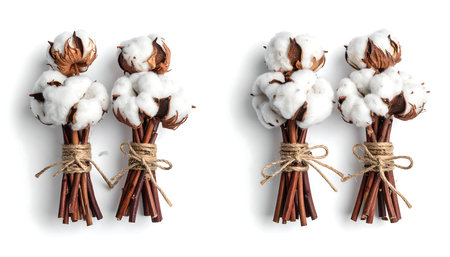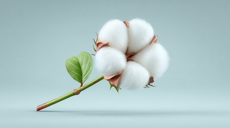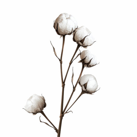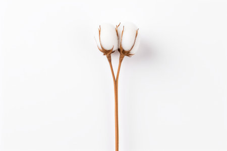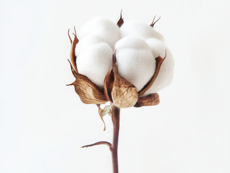 Cotton boll, fluffy white cotton, botanical photography, soft texture, brown stem, natural fibers, macro shot, clean background, detailed plant study, agricultural crop, organic material, minimalist composition, earth tones, studio lighting, high contrast, crisp focus, symmetrical arrangement, raw cotton, close-up nature photography, realistic rendering -