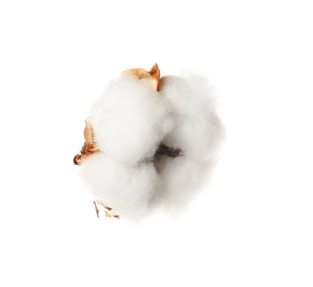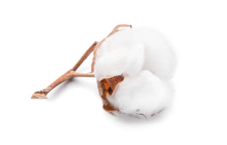 Cotton plant is on a pure white background, fluffy and soft, close-up. Minimalist textiles.